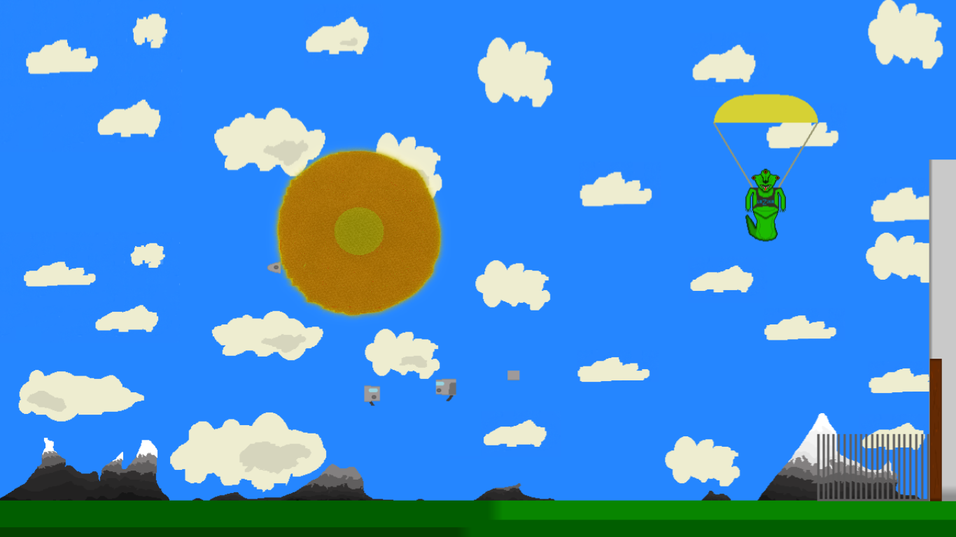 Our alien hero Zorgi is traveling through space between planets when another alien attacks him. Zorgi’s spaceship is damaged, starts falling toward Earth, and explodes.